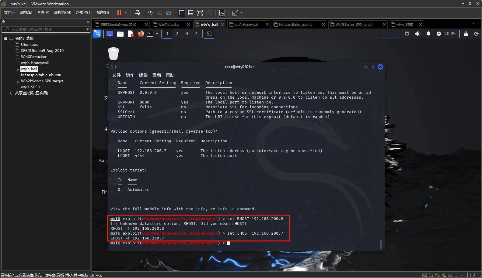 输入命令 set RHOST 192.168.200.8设置win2k虚拟机为靶机,输入命令set LHOST 192.168.200.9设置kali虚拟机为攻击机