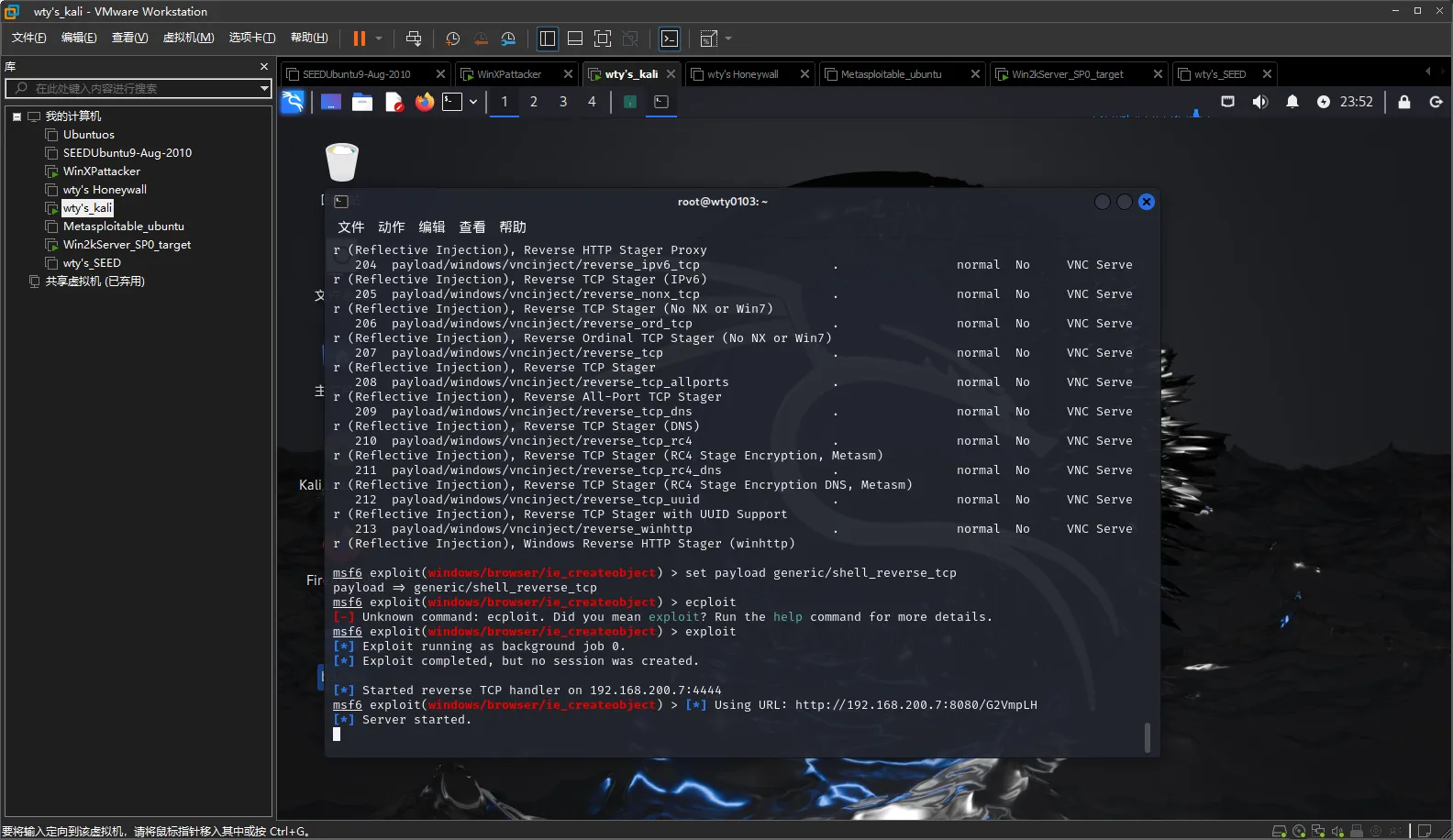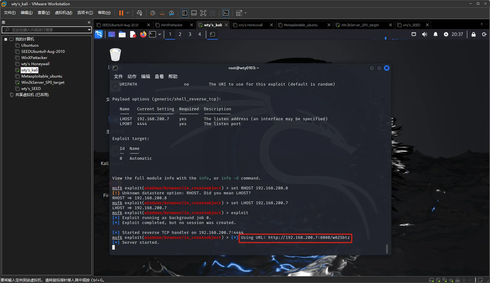 输入exploit开始渗透攻击,得到网页木马链接为:http://192.168.200.7:8080/w8ZSbtz