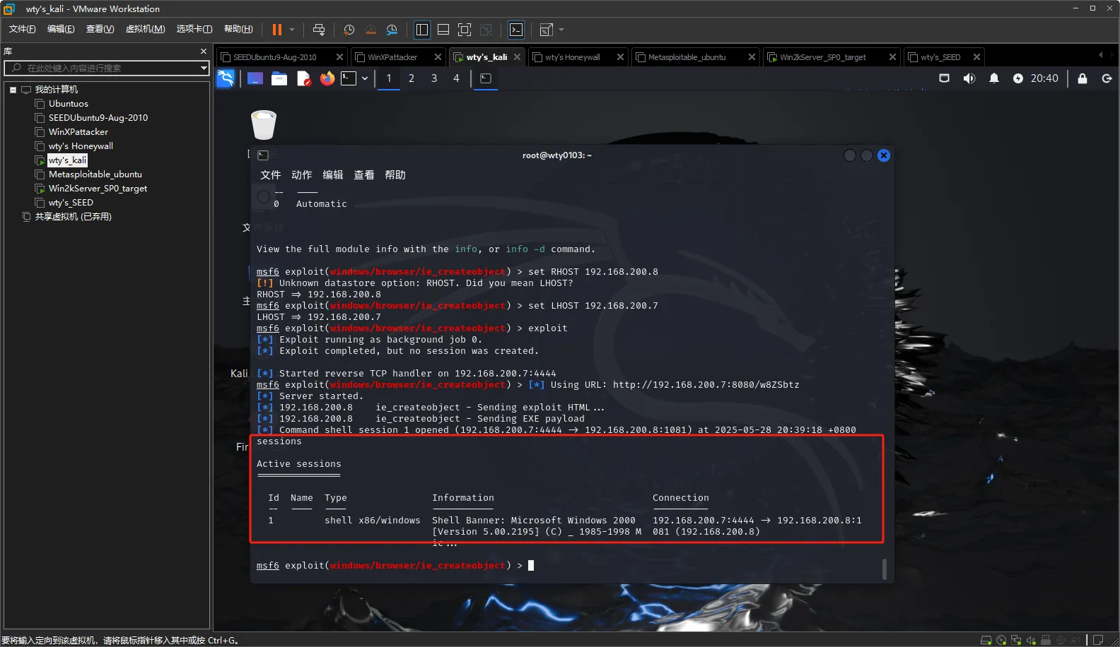 回到攻击机kali,输入sessions查看连接,攻击机kali与靶机win2k已经成功建立终端连接