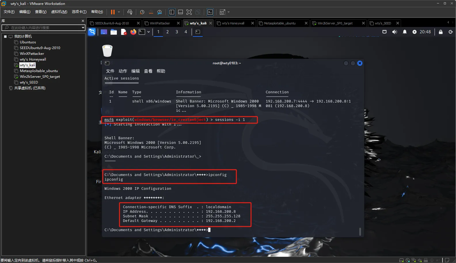 输入命令sessions -i 1取得靶机控制权打开会话,输入ipconfig显示出了靶机win2k的ip信息,说明攻击成功