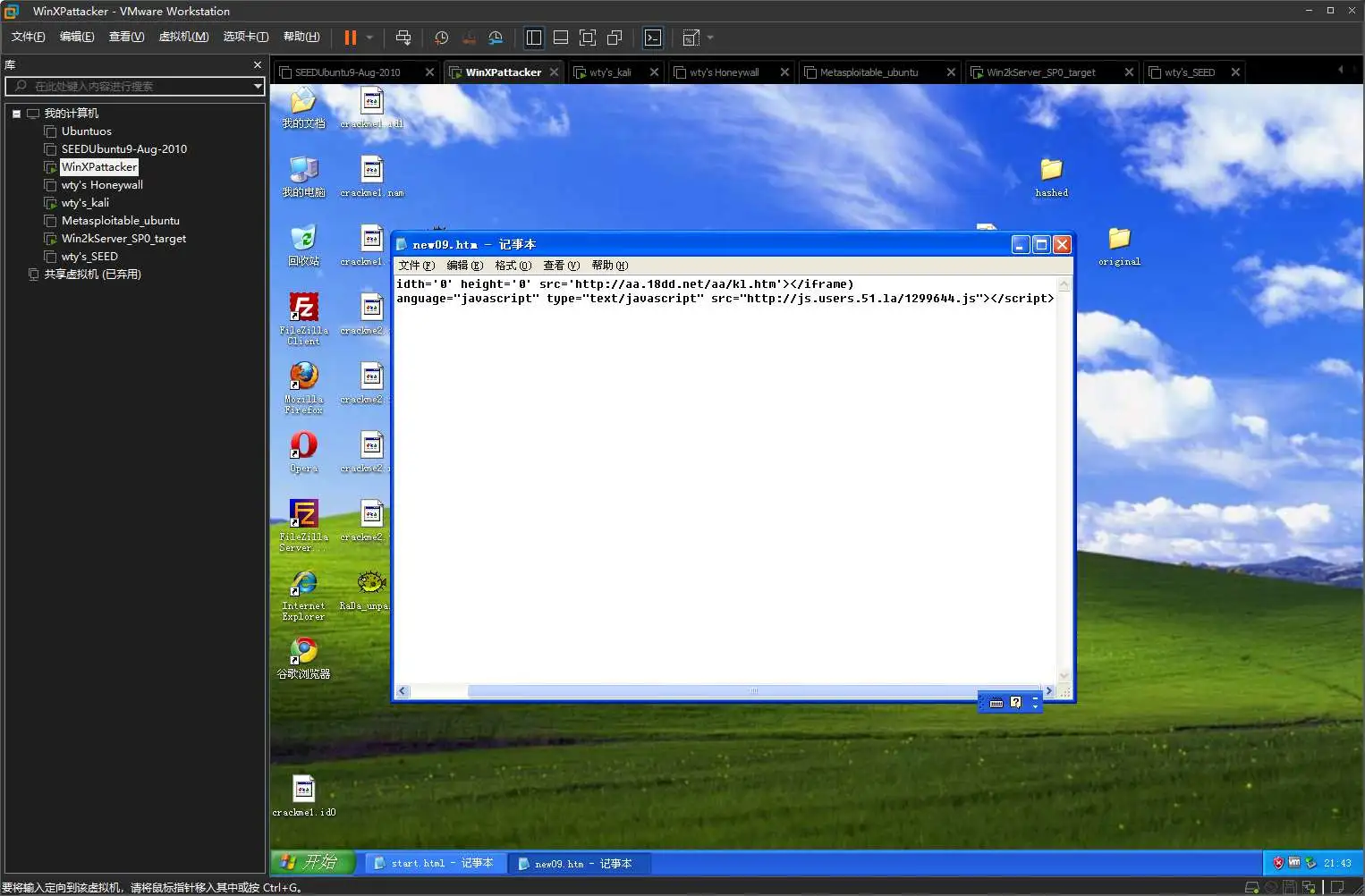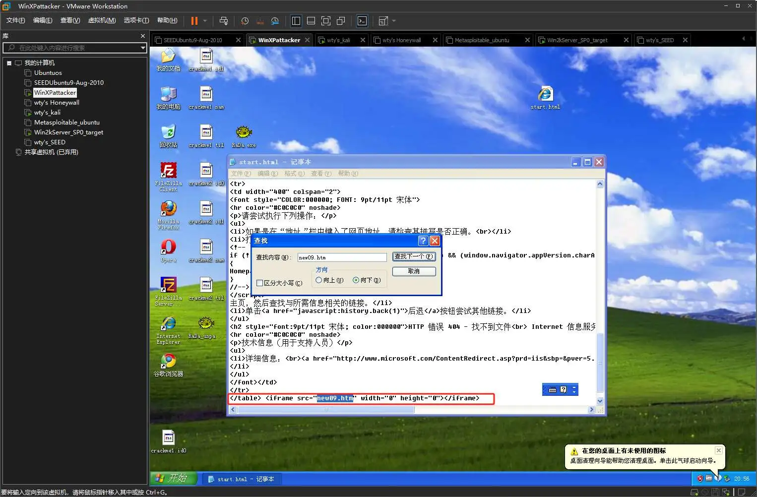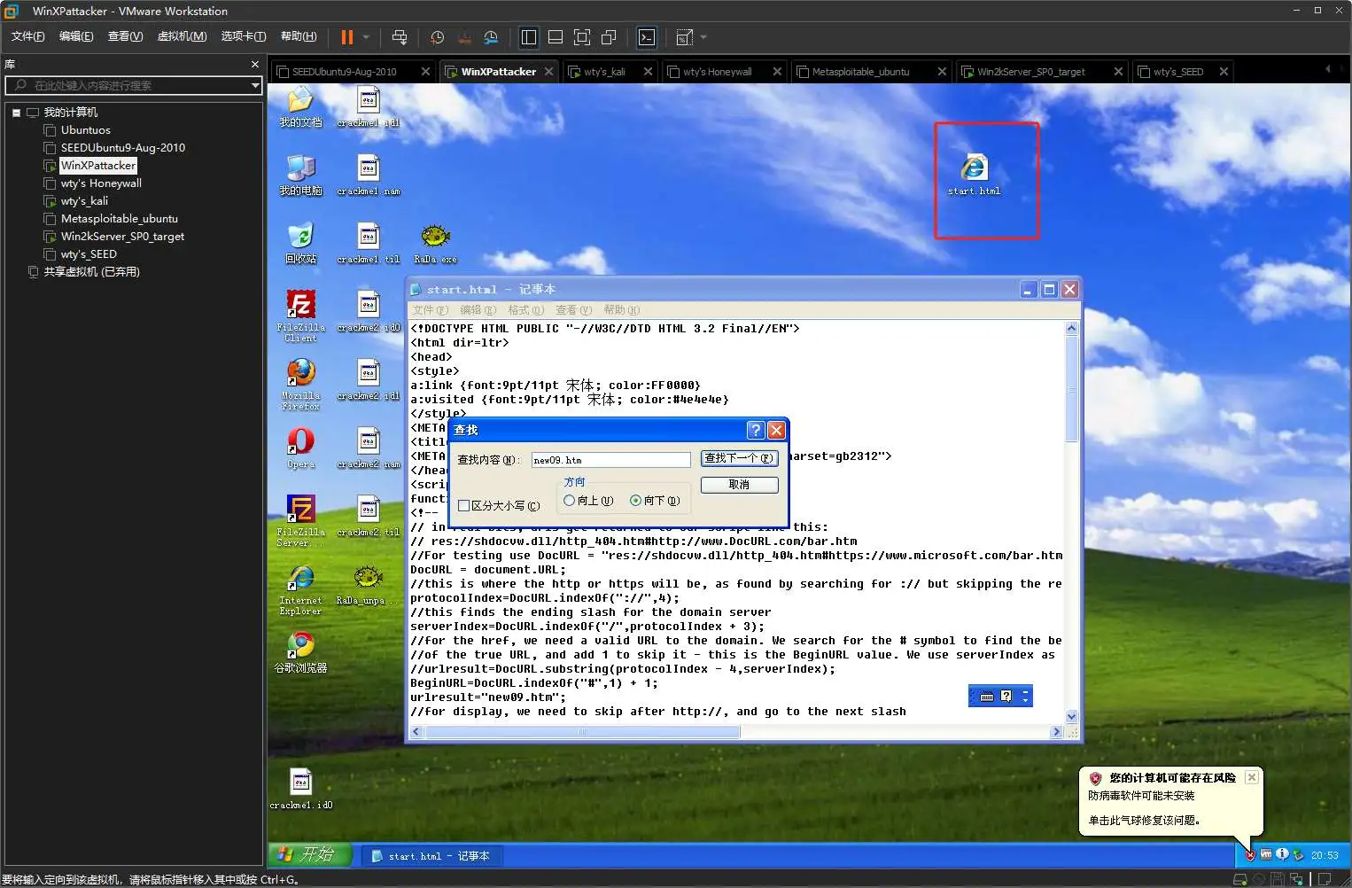 将从学习通上下载的start.html放在虚拟机WinXPattacker的桌面后使用记事本打开文件,查找new09.htm,结果显示有两处与new09.htm相关的字段,可以看出start.html中调用new09.htm使用了相对路径,因此可以使用相同的方式打开new09.htm并进行查看