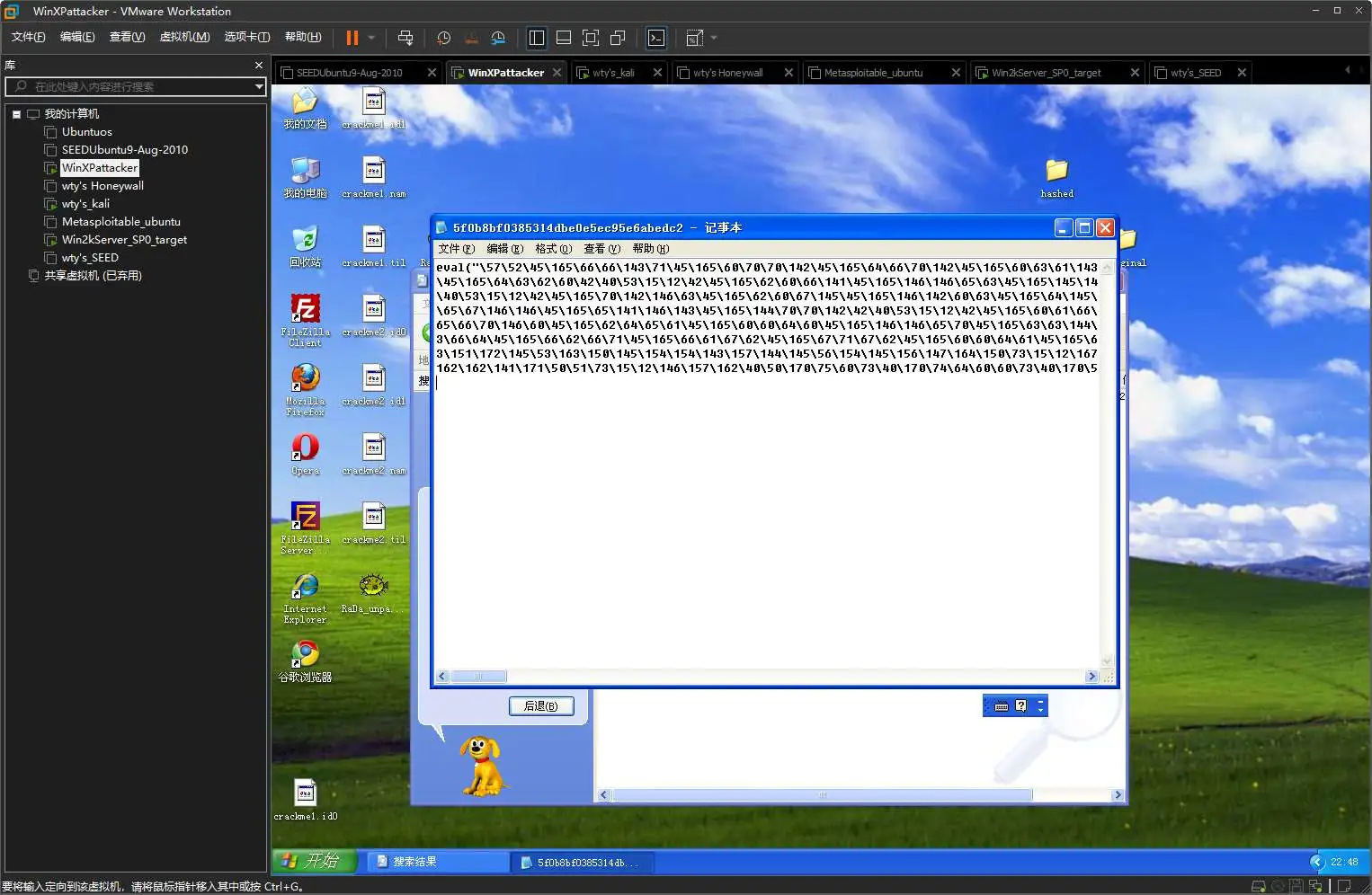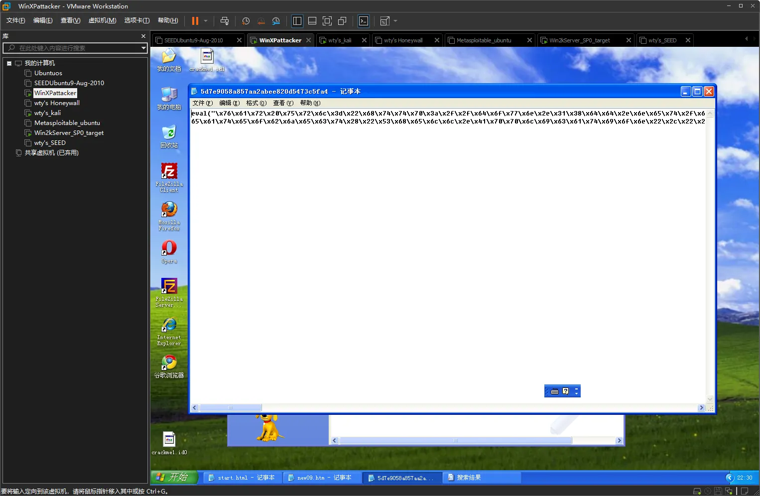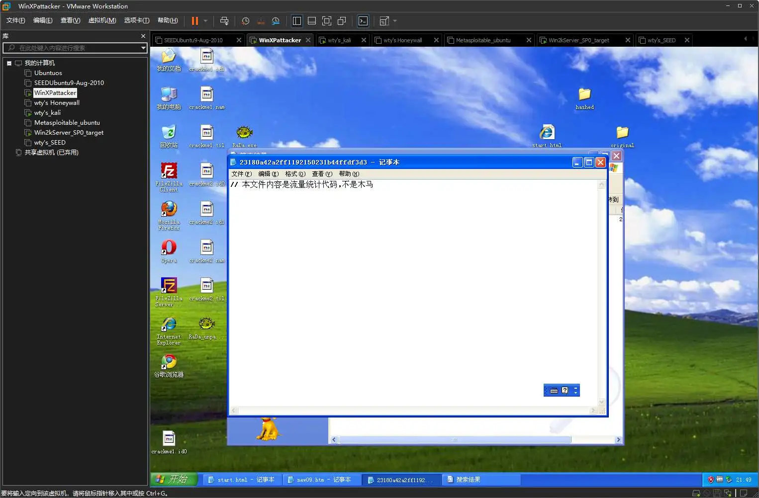 将从学习通上下载的start.html放在虚拟机WinXPattacker的桌面后使用记事本打开文件,查找new09.htm,结果显示有两处与new09.htm相关的字段,可以看出start.html中调用new09.htm使用了相对路径,因此可以使用相同的方式打开new09.htm并进行查看