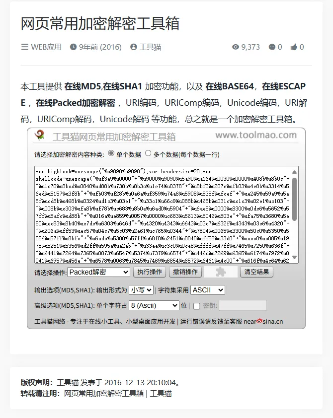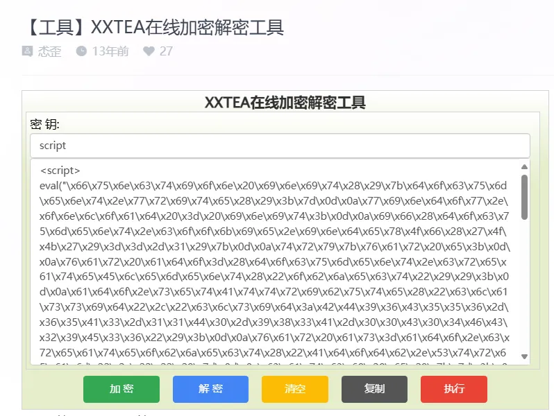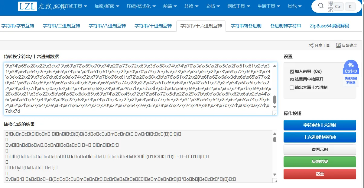 使用XXTEA在线解密工具和得到的密钥script对文件中的密文进行解密后得到了十六进制的密文