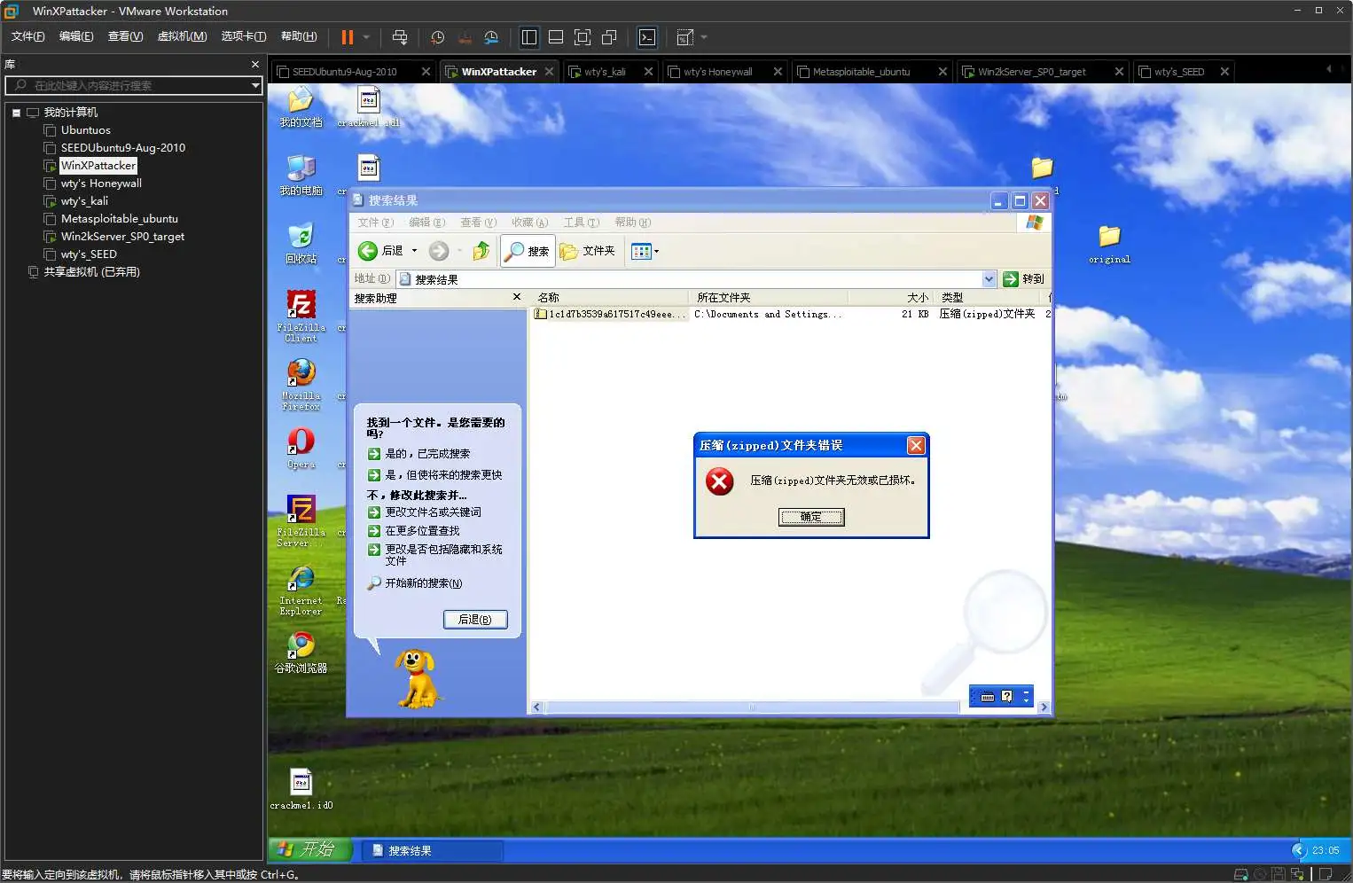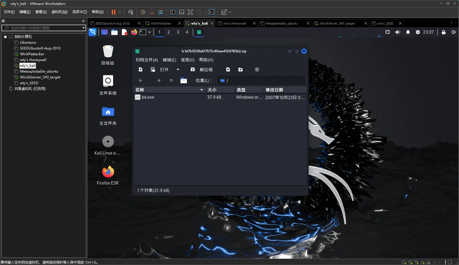 查询散列值对应的文件发现是一个压缩包,修改其后缀名保存后打开显示已损坏,将其复制到kali虚拟机中打开发现其中有一个bd.exe文件,此时便得到了4个exe文件014.exe,bf.exe,pps.exe,bd.exe