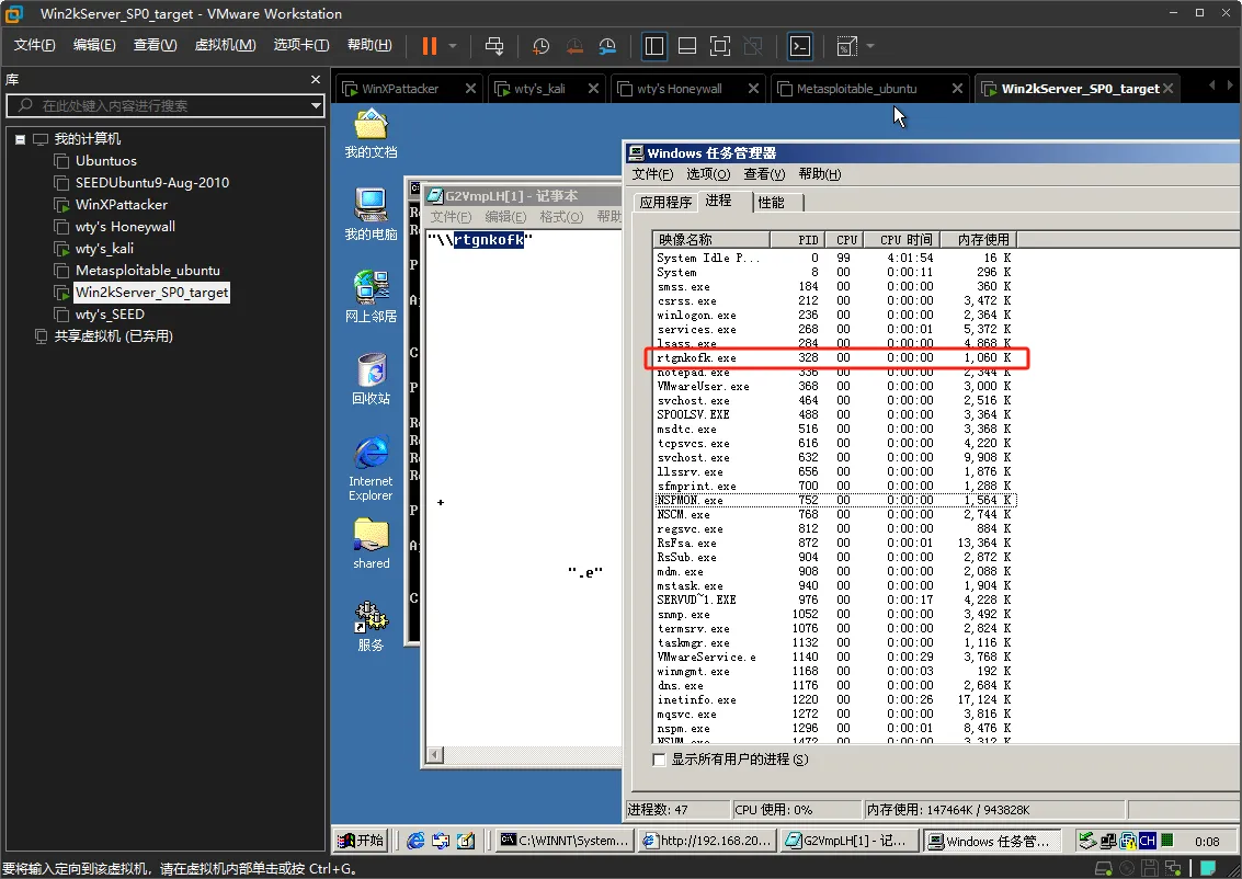 由此可见通过调用document.location加载了payload,还可以看到有可执行文件,在靶机中打开资源管理器,发现有rtgnkofk.exe进程,为攻击机获得靶机控制权和通信的进程