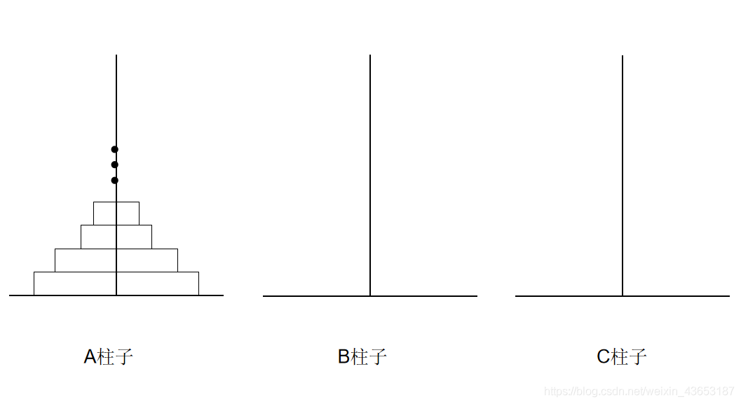汉诺塔说的是有三根柱子A,B,C。 A柱子上有64个从底部到顶部越来越大的圆盘,现在要借助B柱子,来将A柱子上的圆盘全部搬运到C柱子上,且大圆盘不能放在小圆盘上面,请写出算法。(如下图所示)