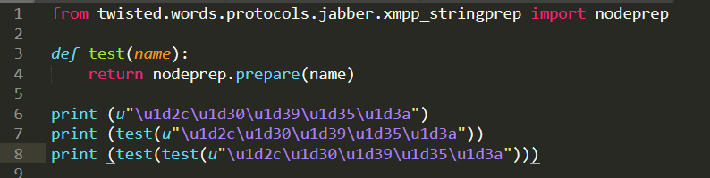 可以知道当使用了nodeprep.prepare()函数之后,如果我们先使用unicode的编码的字符,比如说 ᴬ ,使用该函数之后,他会先变成大写的A,再使用一次就会变成小写的a