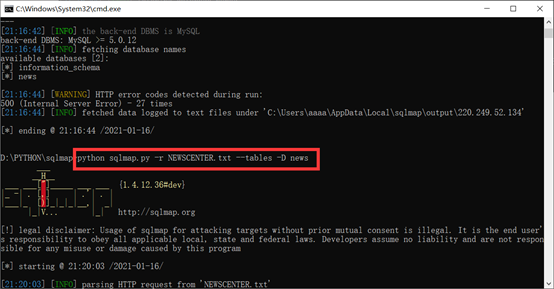python sqlmap.py -r NEWSCENTER.txt --tables -D news