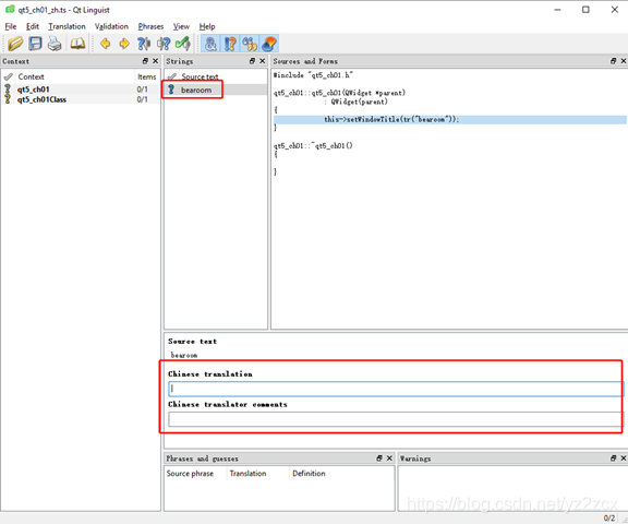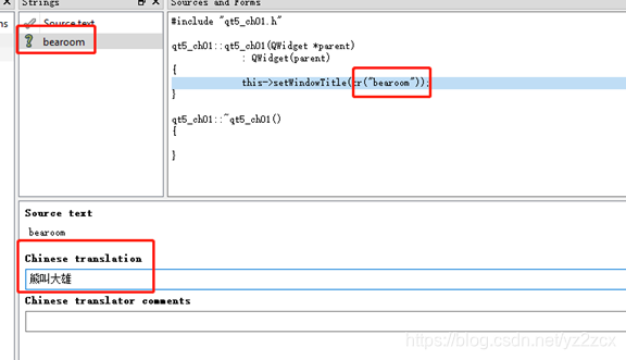 然后就要可以看到我代码里面有哪些字符串被tr()包围着的,然后选择该字符串,并在下方输入中文翻译: