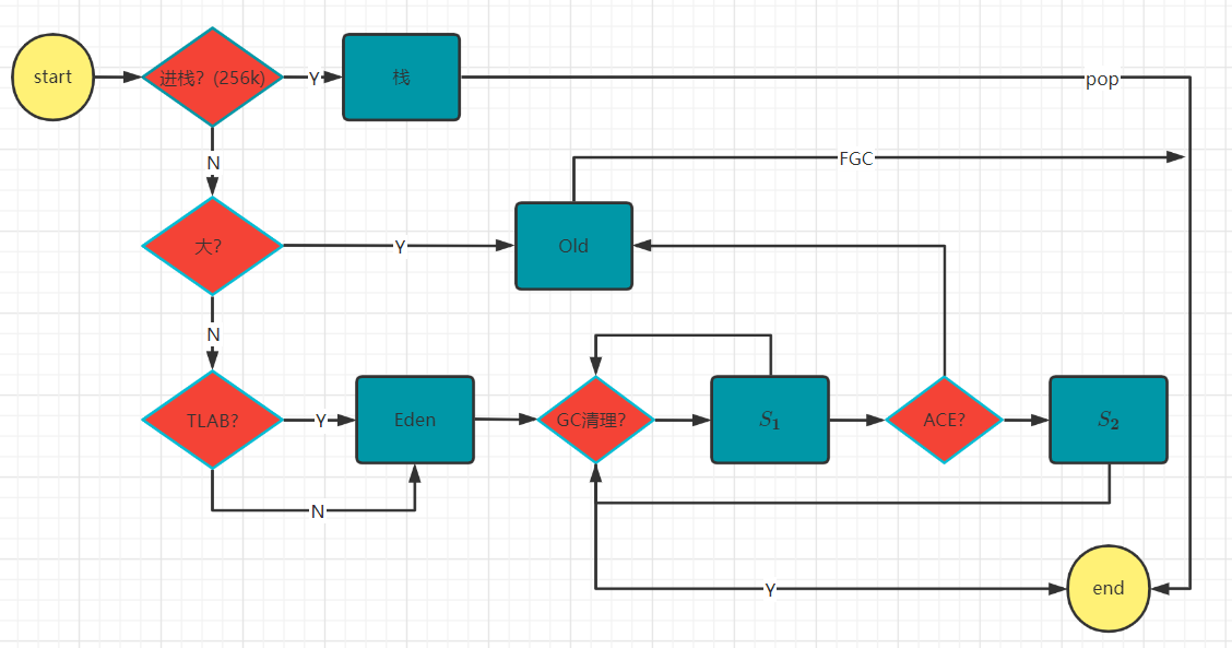 - 首先尝试在栈上分配,栈上分配有两个标准需要满足:①逃逸分析 ②标量替换,栈只有256个字节,所以还需要小对象,大对象之间进入老年代,然后被全栈回收(FGC)。栈上分配的对象会随着方法的结束栈帧弹出而消亡,无需GC处理。