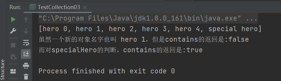 System.out.print("虽然一个新的对象名字也叫 hero 1,但是contains的返回是:");