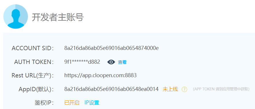 Rest URL(生产): app.cloopen.com:8883 [项目上线时使用真实短信发送服务器]