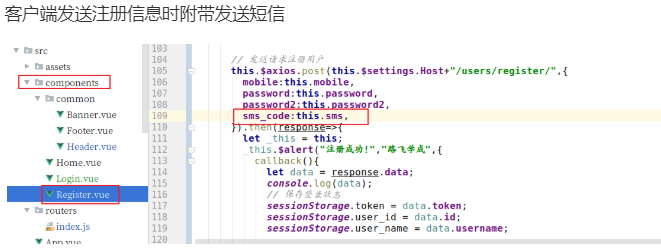 <template> .... <div class="sms-box"> <input v-model = "sms" type="text" placeholder="输入验证码" class="user"> <div class="sms-btn" @click="smsHandle">{{sms_text}}</div> </div> .... </template> <script> export default { name: 'Register', data(){ return { sms:"", mobile:"", password:"", password2:"", validateResult:false, is_send:false, // 是否已经发送短信的状态 send_intervel:60, // 发送短信的间隔 sms_text:"点击发送短信", // 发送短信的提示 } }, methods:{ // 发送短信 smsHandle() { // 判断是否填写了手机 if( !/^\d{11}$/.test(this.mobile) ){ this.$alert('手机号码格式有误!', '警告'); return false; } // 判断是否在60s内有发送过短信,如果有则,不能点击发送 if(this.is_send){ this.$alert('60s内不能频繁发送短信!', '警告'); return false; } let _this = this; _this.$axios.get(_this.$settings.Host+`/users/sms/${_this.mobile}/`).then(response=>{ let data = response.data; if( data.result == '-1' ){ _this.$alert("发送短信失败!","错误"); }else{ _this.is_send = true; _this.$alert("发送短信成功了!","成功",{ callback(){ let num = _this.send_intervel let timer = setInterval(()=>{ if(num<1){ clearInterval(timer); _this.sms_text = "点击发送短信"; _this.is_send = false; }else{ num--; _this.sms_text = num+"后可继续点击发送"; } },1000) } }); } }).catch(error=>{ console.log(error.response) }) }, // 提交注册信息 registerHander(){ .... } }, }; </script>