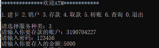 printf("\n1.建卡 2.销户 3.存款 4.取款 5.转账 6.查询 0.退出\n");