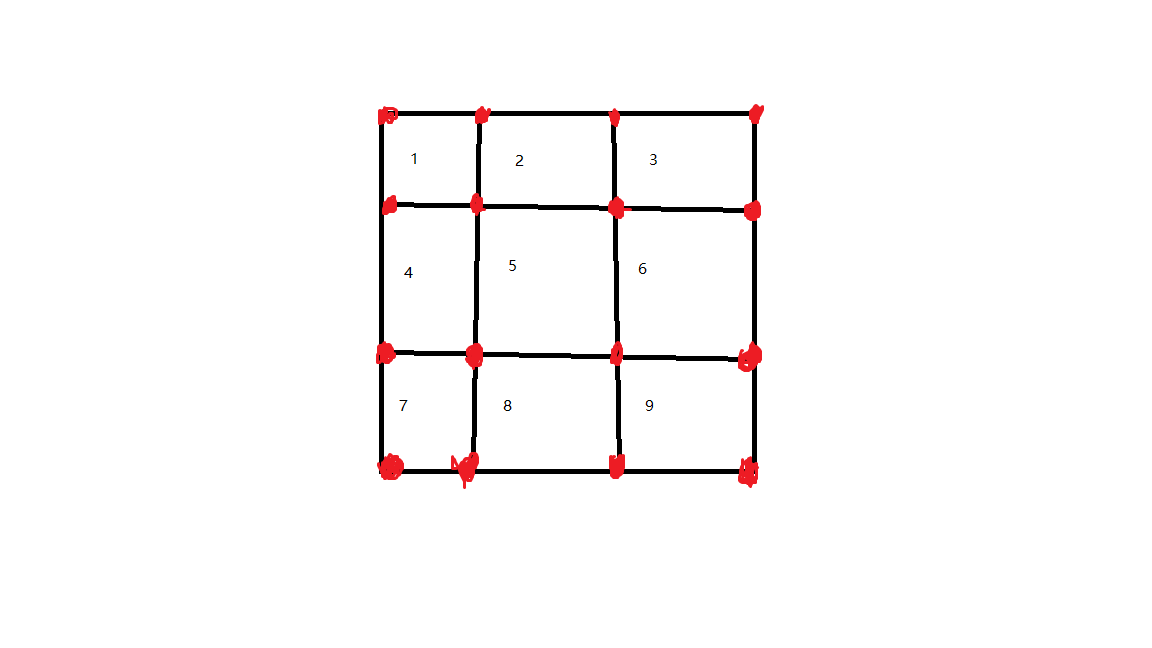 如图,题中图上的点实际为红点,记录格子里的点,初始格子里的点不连通,当删除一条边时,如果边两侧的格子已经联通,那么删除这条边后,就会使图上的点不连通,否则合并即可。