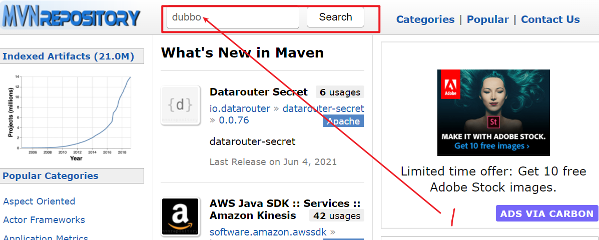 2. 进入[https://mvnrepository.com](),查找需要引入的jar包及名称