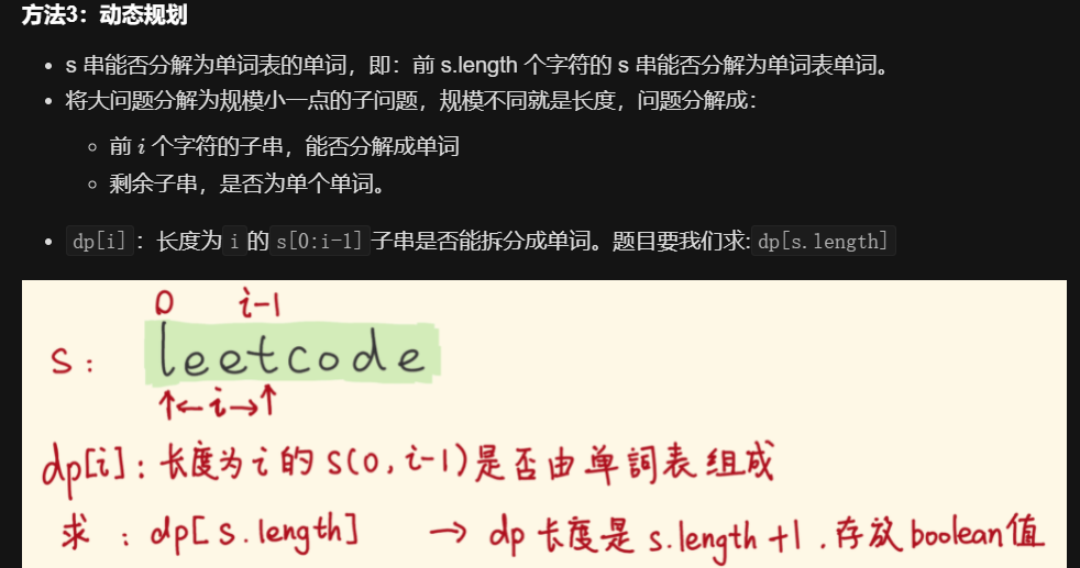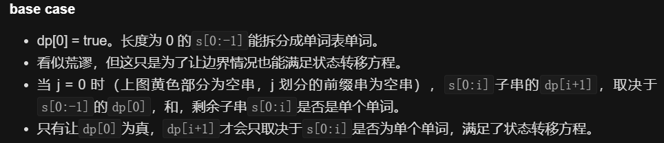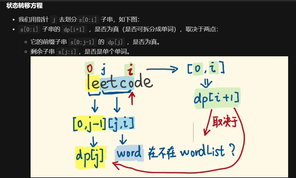 dp[i]表示s前i个字符能否完全拆分为wordDict中的"某几个单词"(即:未必是全部)