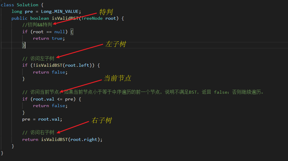 - 二叉搜索树「中序遍历」得到的值构成的序列一定是升序的,这启示我们在中序遍历的时候实时检查当前节点的值是否大于前一个中序遍历到的节点的值即可。如果均大于说明这个序列是升序的,整棵树是二叉搜索树。