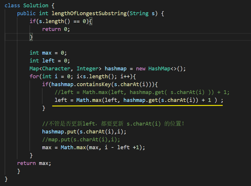 另外,更新left后,不管原来的 s.charAt(i) 是否在最长子段中,我们都要将 s.charAt(i) 的位置更新为当前的i,