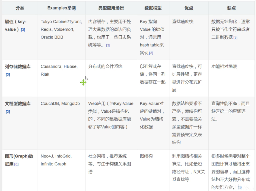 由于不可能用一种数据结构化存储应付所有的新的需求,因此,非关系型数据库严格上不是一种数据库,应该是一种数据结构化存储方法的集合 -