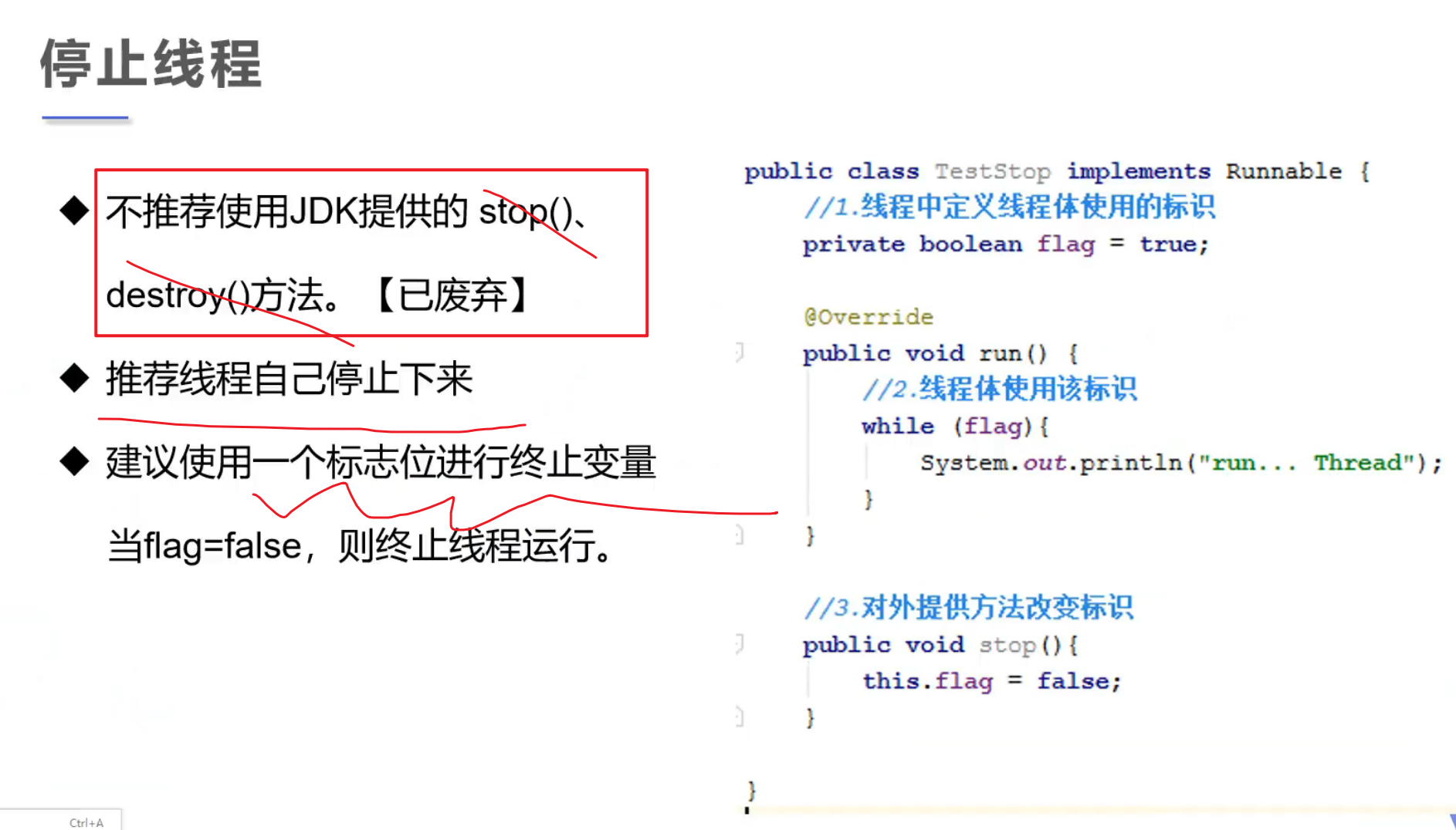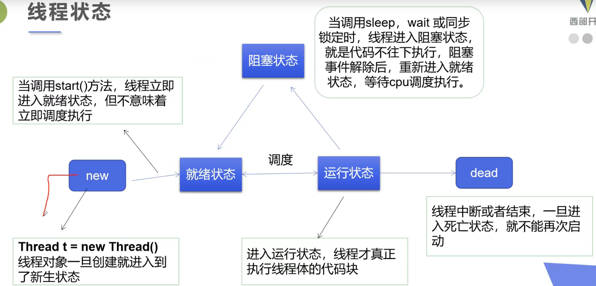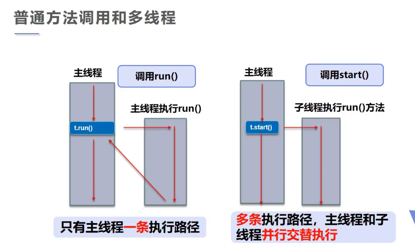 - new ⼀个 Thread,线程进⼊了新建状态。调⽤ start()⽅法,会启动⼀个线程并使线程进⼊了就绪状态,当分配到时间⽚后就可以开始运⾏了。start() 会执⾏线程的相应准备⼯作,然后⾃动执⾏ run() ⽅法的内容,这是真正的多线程⼯作。 但是,直接执⾏ run() ⽅法,会把 run() ⽅法当成⼀个 main 线程下的普通⽅法去执⾏,并不会在某个线程中执⾏它,所以这并不是多线程⼯作。