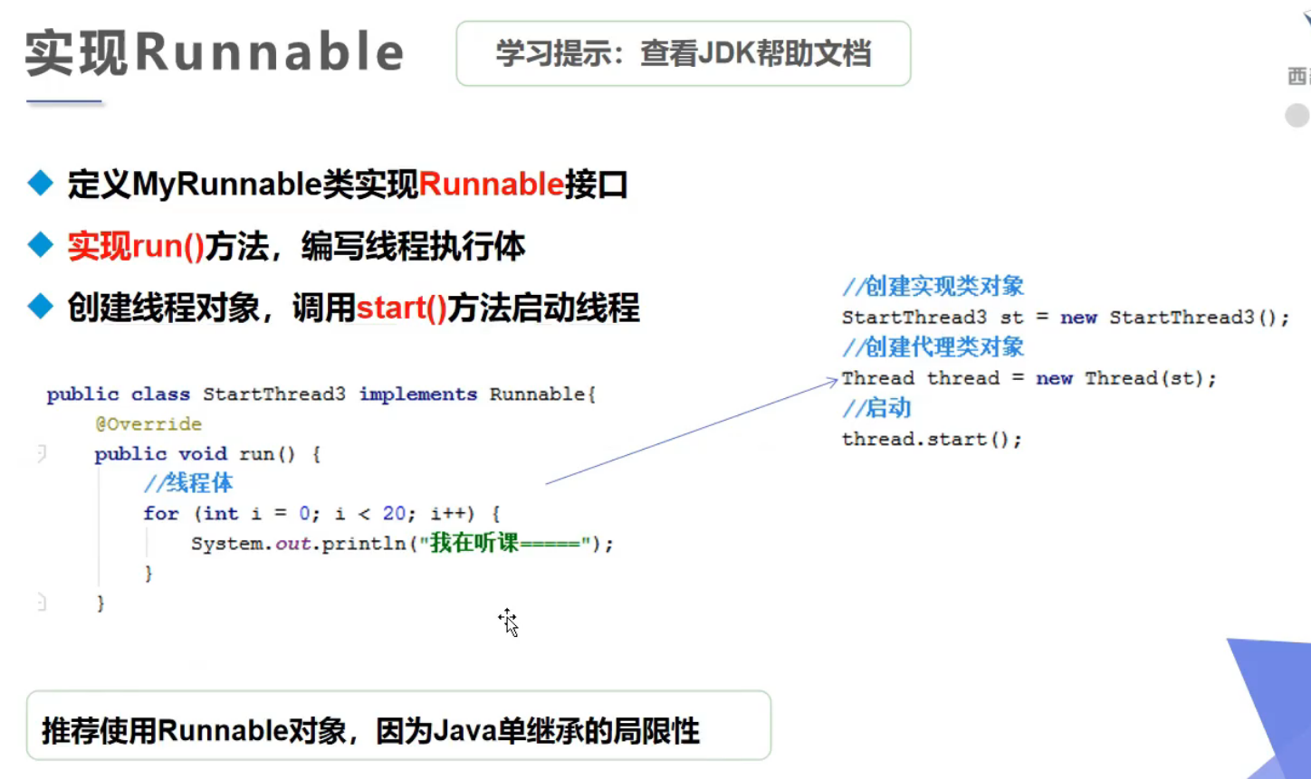 创建方式二:实现Runnable接口,重写run()方法,执行线程需要丢入runnable接口实现类,调用start()开启线程