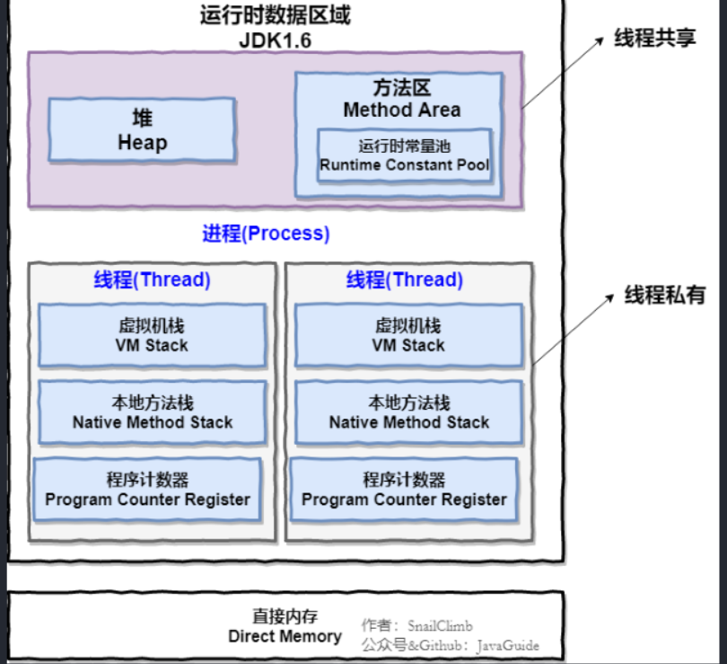 另外,为了线程切换后能恢复到正确的执⾏位置,每条线程都需要有⼀个独⽴的程序计数器,各线程之间计数器互不影响,独⽴存储,我们称这类内存区域为“线程私有”的内存。