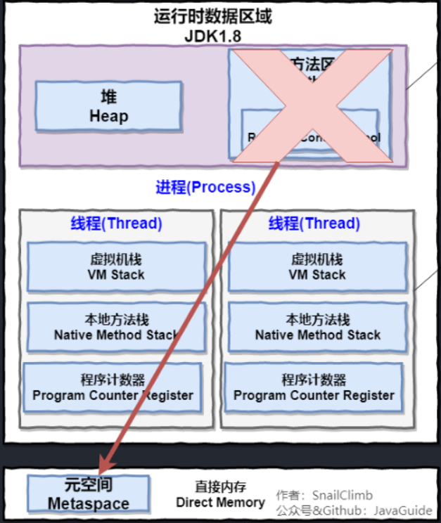 - ⽅法区与 Java 堆⼀样,是各个线程共享的内存区域,它⽤于存储已被虚拟机加载的类信息、常量、静态变量、即时编译器编译后的代码等数据。虽然 Java 虚拟机规范把⽅法区描述为堆的⼀个逻辑部分,但是它却有⼀个别名叫做 Non-Heap(⾮堆),⽬的应该是与 Java 堆区分开来。