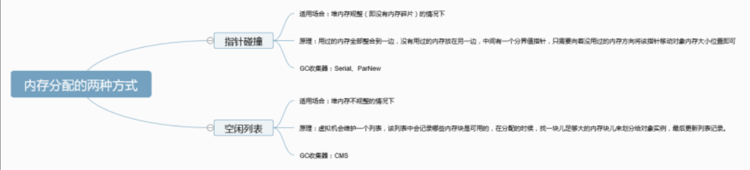 在类加载检查通过后,接下来虚拟机将为新⽣对象分配内存。对象所需的内存⼤⼩在类加载完成后便可确定,为对象分配空间的任务等同于把⼀块确定⼤⼩的内存从 Java 堆中划分出来。分配⽅式有 “指针碰撞” 和 “空闲列表” 两种,选择哪种分配⽅式由 Java 堆是否规整决定,⽽ Java 堆是否规整⼜由所采⽤的垃圾收集器是否带有压缩整理功能决定。