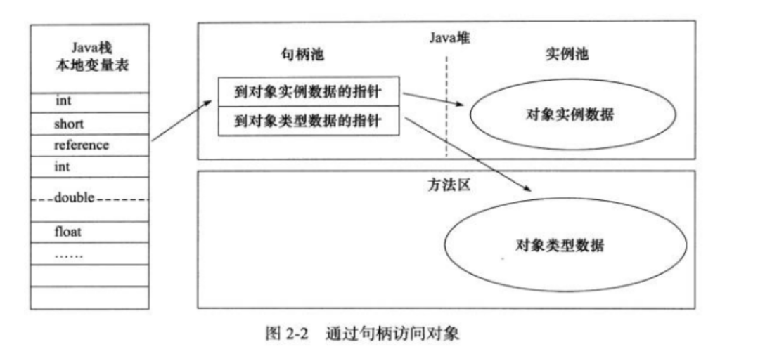 句柄: 如果使⽤句柄的话,那么Java堆中将会划分出⼀块内存来作为句柄池,reference 中存储的就是对象的句柄地址,⽽句柄中包含了对象实例数据与类型数据各⾃的具体地址信息;