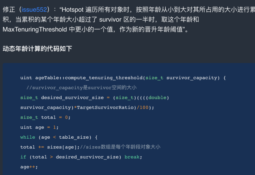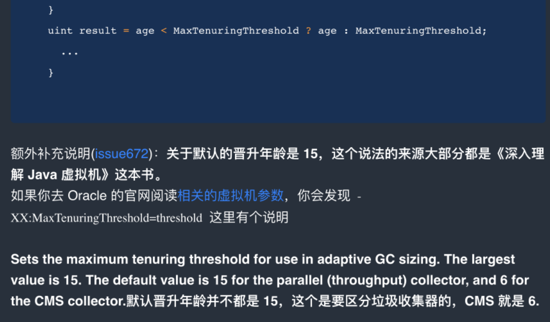 如果对象在 Eden 出⽣并经过第⼀次 Minor GC 后仍然能够存活,并且能被 Survivor 容纳的话,将被移动到 Survivor 空间中,并将对象年龄设为 1.对象在 Survivor 中每熬过⼀次 MinorGC,年龄就增加 1 岁,当它的年龄增加到⼀定程度(默认为 15 岁),就会被晋升到⽼年代中。对象晋升到⽼年代的年龄阈值,可以通过参数 -XX:MaxTenuringThreshold 来设置。