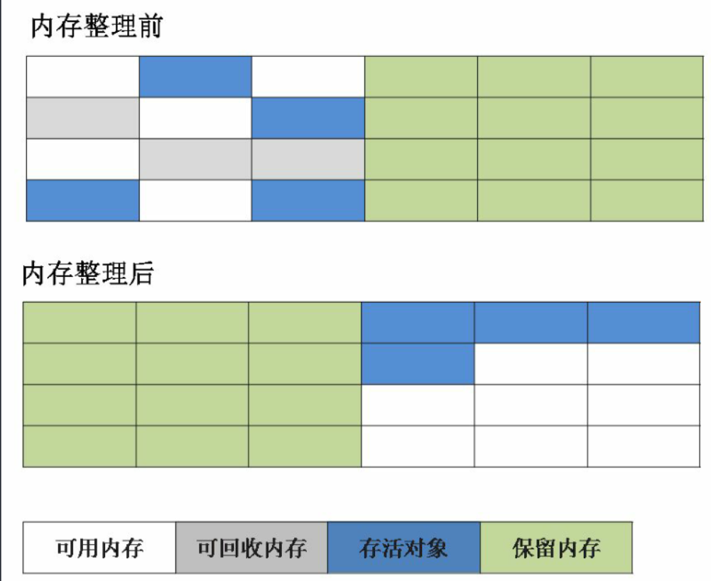 根据⽼年代的特点提出的⼀种标记算法,标记过程仍然与“标记-清除”算法⼀样,但后续步骤不是直接对可回收对象回收,⽽是让所有存活的对象向⼀端移动,然后直接清理掉端边界以外的内存。