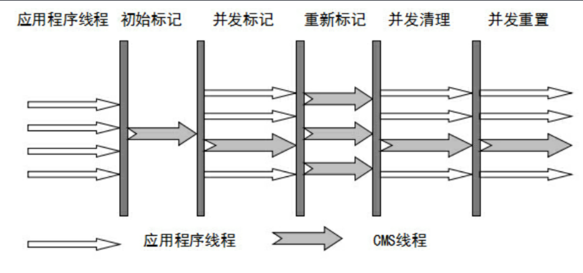 从名字中的Mark Sweep这两个词可以看出,CMS 收集器是⼀种 “标记-清除”算法实现的,它的运作过程相⽐于前⾯⼏种垃圾收集器来说更加复杂⼀些。整个过程分为四个步骤: