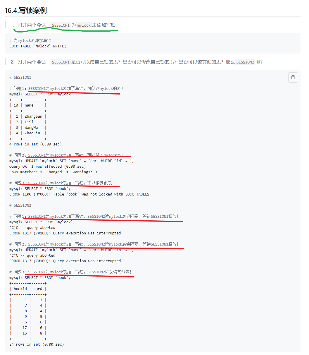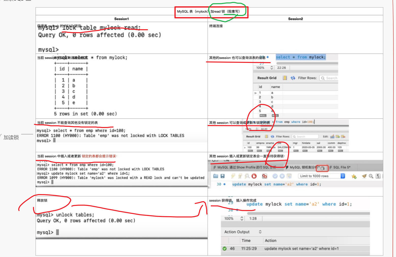 - 锁定表之后,能读自己,但无法改自己,也无法读别的表;别的session也能读,