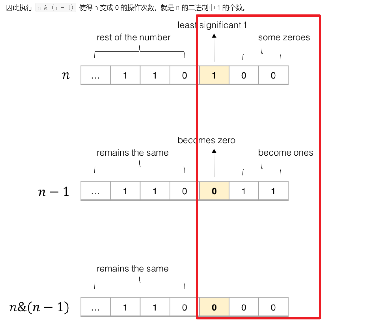 n & (n - 1) 的技巧可以消除二进制中最后一个 1