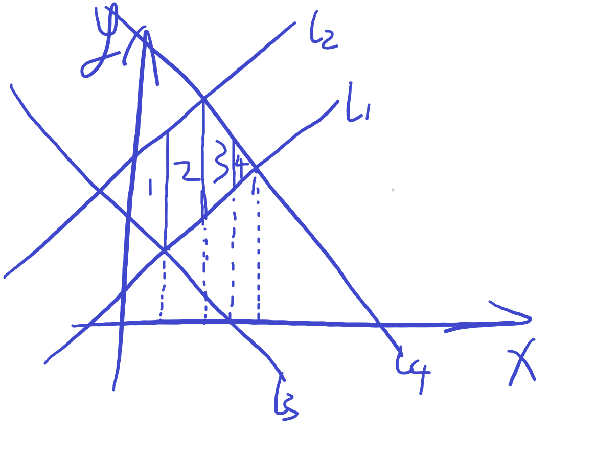 可能说的比较抽象,这个示意图意会一下吧,将夹在 \(l_1,l_2,l_3,l_4,x=0,y=0\) 的面积按横坐标分成 \(4\) 块。