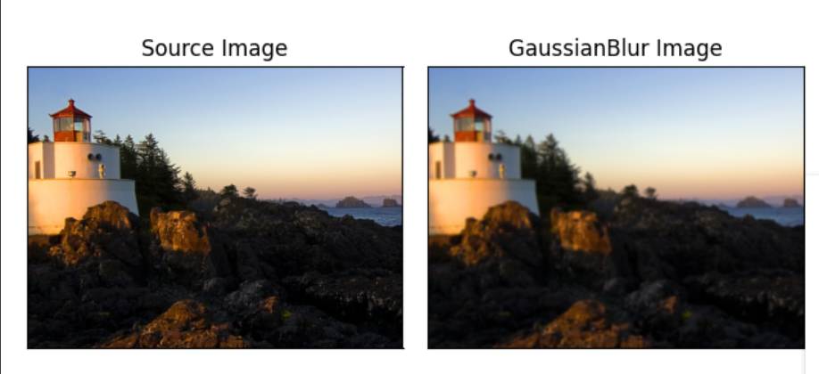 import cv2 import matplotlib.pyplot as plt # 读取图片 img = cv2.imread('../images/02.jpg') source = cv2.cvtColor(img, cv2.COLOR_BGR2RGB) # 高斯滤波,这里使用15*15的卷积核 0表示滤波器的标准差 result = cv2.GaussianBlur(source, (15, 15), 0) # 显示图形 titles = ['Source Image', 'GaussianBlur Image'] images = [source, result] for i in range(2): plt.subplot(1, 2, i+1), plt.imshow(images[i], 'gray') plt.title(titles[i]) plt.xticks([]), plt.yticks([]) plt.show()