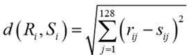 分别对模板图(参考图,reference image)和实时图(观测图, observation image)建立关键点描述子集合。目标的识别是通过两点 集内关键点描述子的比对来完成。具有128维的关键点描述子的相似 性度量采用欧式距离。