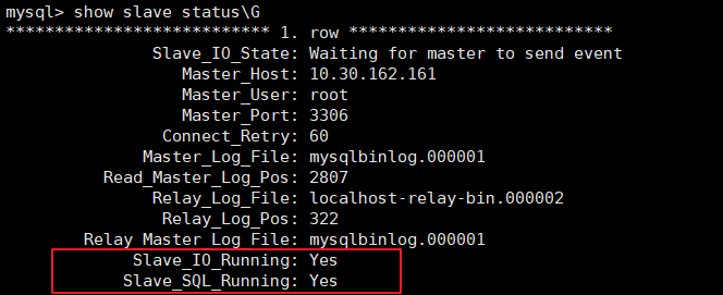 查看主库线程状态 show processlist\G ERROR 2006 (HY000): MySQL server has gone away No connection. Trying to reconnect... Connection id: 6 Current database: *** NONE *** *************************** 1. row *************************** Id: 4 User: root Host: 10.30.162.162:53696 db: NULL Command: Binlog Dump Time: 1225 State: Master has sent all binlog to slave; waiting for more updates Info: NULL *************************** 2. row *************************** Id: 6 User: root Host: localhost db: NULL Command: Query Time: 0 State: starting Info: show processlist 2 rows in set (0.00 sec) ###### 查看从库的线程状态 mysql> show processlist\G *************************** 1. row *************************** Id: 8 User: root Host: localhost db: test Command: Query Time: 0 State: starting Info: show processlist *************************** 2. row *************************** Id: 41 User: system user Host: db: NULL Command: Connect Time: 4171 State: Waiting for master to send event Info: NULL *************************** 3. row *************************** Id: 42 User: system user Host: db: NULL Command: Connect Time: 4474 State: Slave has read all relay log; waiting for more updates Info: NULL 3 rows in set (0.01 sec)