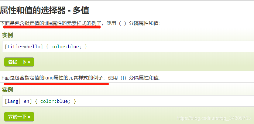 | 是表示为 所属性的值的单词中 包含 表达式中的值,如 en-us