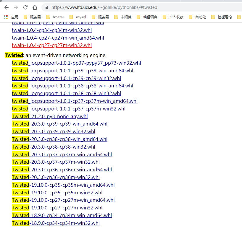 ①.进入网站https://www.lfd.uci.edu/~gohlke/pythonlibs/ 搜索 twisted