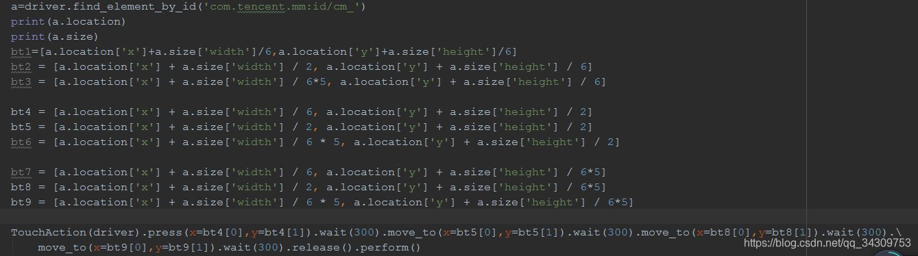 TouchAction(driver).press(x=bt1[0],y=bt1[1]).wait(300).move_to(x=bt5[0],y=bt5[1]).wait(300).move_to(x=bt8[0],y=bt8[1]).wait(300).\