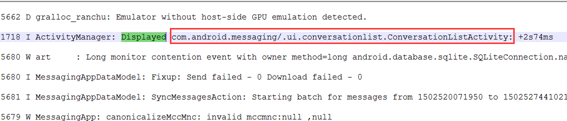 方法3 .adb logcat | grep Displayed (windows在adb shell 下键入:logcat | grep Displayed),显示当前显示的应用