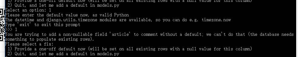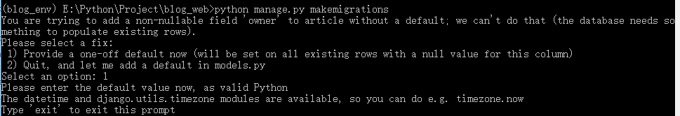 3.运行python manage.pu makemigrations 时,提示增加默认值,