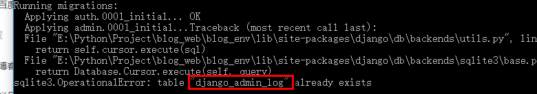 7.此时将django 的默认数据库db.sqlite3中的表:django_migrations 记录清空,不断执行python manage.py makemigrations ,根据提示删除数据库相应的表(需根据提示按顺序删除),提示语如下图: