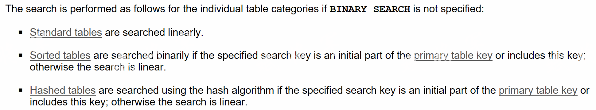 当排序表的关键字段,在READ查询中未使用,则会进行线性搜索,比如: